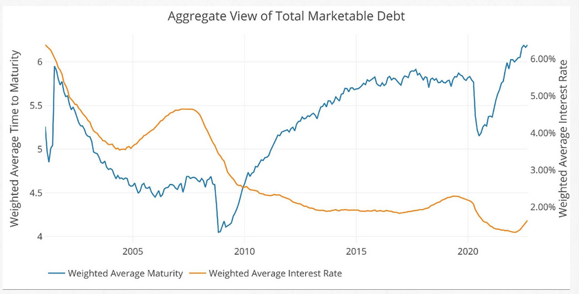 Takže zvednete úrokovou míru, aby si ten šrot vůbec někdo koupil, tedy ti, komu to nařídíte imperiálním telefonem. A podívejte se, co bude USA splácet v příštích letech. Je to jasné, protože stávající úroková míra byla kolem 2 % a vaše dluhopisy musí alespoň částečně kopírovat inflaci tak dva roky dopředu, při 3-letých státních obligacích. Splátky dané ve statistickém průměru 3,49 roku dělají 44,2% zůstatku z celkem 31 biliónů dolarů. Jen do prosince 2024 se má platit okolo 6 biliónů za úroky. Nyní si představte trvale zvýšenou úrokovou míru, to je masakr dolarovou pilou. Takže jsme dostali kompletní začarovaný kruh na státní imperiální úrovni.