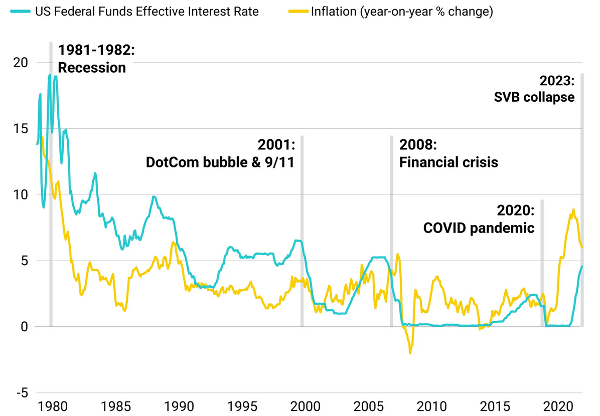 Pozorujeme zajímavou věc: Válka zvedne deficit země, protože zničený tank na frontě dá vydělat jen jednomu promile zbrojařů. To jsou ty špice v modré. Pak si USA natiskly dluhové peníze, které formou válečných půjček daly do oběhu. Státní emise kopírují ty deficity v šedé. Ale za ty papírky si nic nekoupíte, naopak: Banky vám na vaše běžné investice nepůjčí, protože na chudé musí být za války dvojnásobná přísnost (oranžová). A ten ohromný propad investic je slavná hospodářská krize 1933. Houstone, máme problém: vedeme prohrané proxy-války, kde nám ničí zdroje 1:100; natiskli jsme záchodový papír válečných dluhopisů, ale tím nám roste inflace. A lidi si za vyšší, anti-inflační úroky nepůjčují, protože už jsou beztak chudí jako kostelní myši. Takže se podívejme na další graf, což je poměr inflace a úrokových sazeb v historii USA.