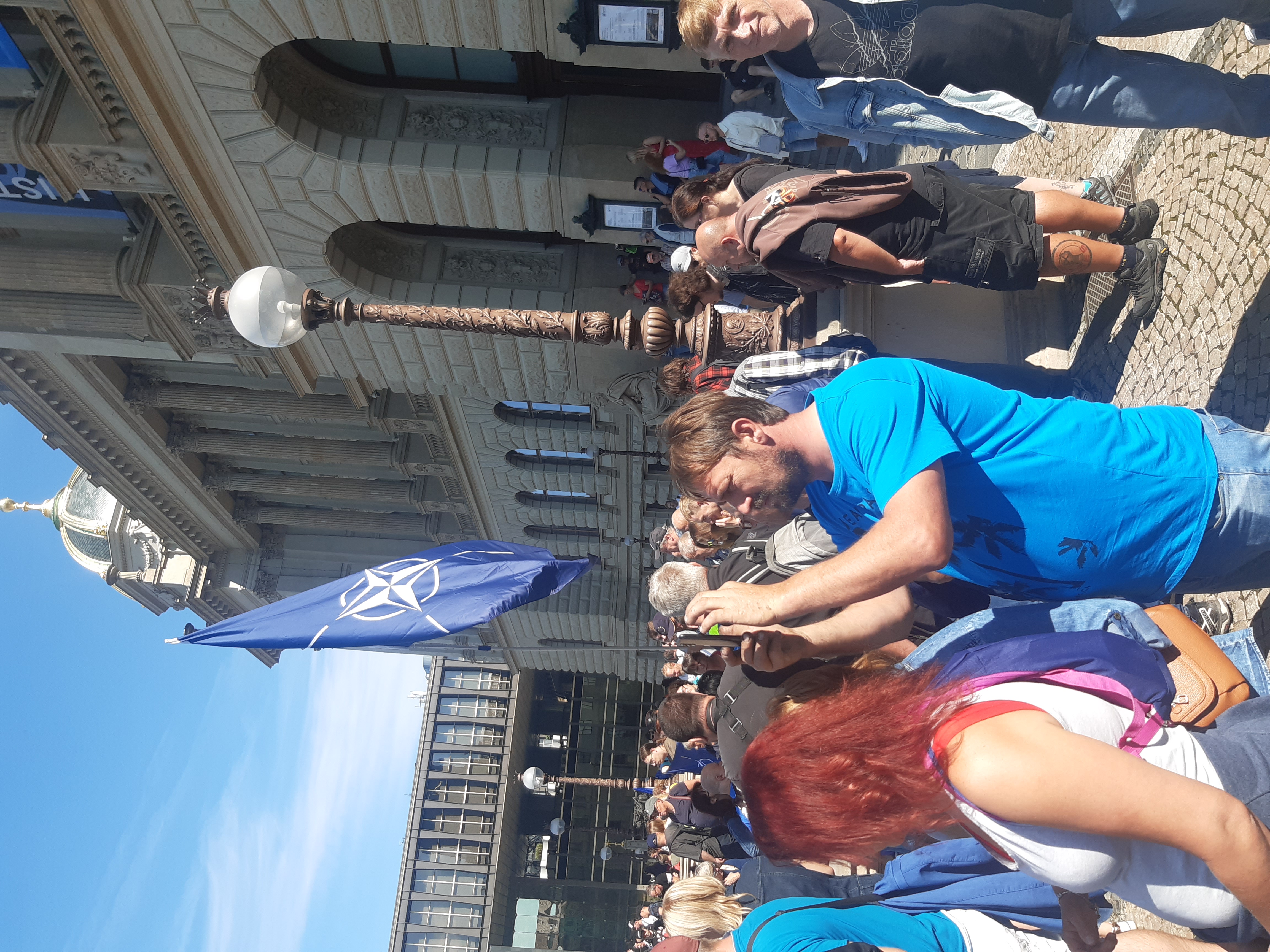 Na demonstraci jsme s rodinou dorazili s mírným zpožděním a chystali se zaujmout vyhlédnuté strategické místo na ochozu Národního muzea. Tam ale vlály vlajky NATO a Ukrajiny a navíc mezi lidmi s protaženými obličeji jsme se necítili komfortně. Pohled takto shora na Václavské náměstí působil vskutku impozantně, hlava na hlavě, kam oko dohlédlo.