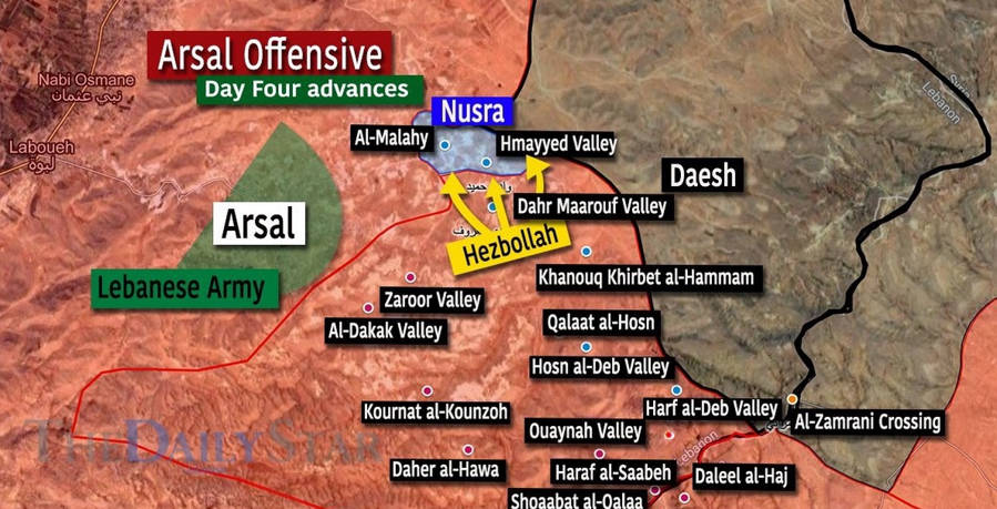 Následující mapa ukazuje čtvrtý den bojů u Arsalu. Hizballáh vedl rozhodující útok na dobře opevněná stanoviště teroristů plná západních a izraelských zbraní. Hizballáh za značných ztrát prolomil obranu al-Núsry a dobyl strategické výšiny ukázané na mapě.