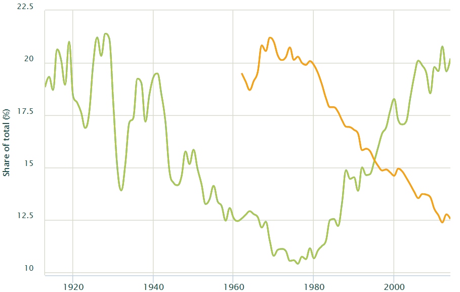 Schválně jsem klikl na rok 1929 před Velkou krizí a před nástupem fašismu. Sami vidíte, že na druhé straně grafu okolo roku 2014 vyjíždí v hlavních zemích světa zhruba stejné rozdělení bohatství. Jedno procento vyvolených bere ze společného koláče kolem 20 %. A nyní se podívejme na chudnutí dolních 50 % obyvatelstva v průběhu celého století. Opět je k dispozici jen statistika z několika západních zemí, ale i ta je dost výmluvná. Databáze se spoléhá v případě chudých jen na data od Pikettyho průlomové práce o kapitálu XX. století. Podívejte se na nástup neoliberalismu.