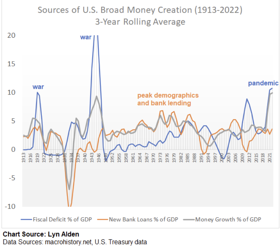 Pozorujeme zajímavou věc: Válka zvedne deficit země, protože zničený tank na frontě dá vydělat jen jednomu promile zbrojařů. To jsou ty špice v modré. Pak si USA natiskly dluhové peníze, které formou válečných půjček daly do oběhu. Státní emise kopírují ty deficity v šedé. Ale za ty papírky si nic nekoupíte, naopak: Banky vám na vaše běžné investice nepůjčí, protože na chudé musí být za války dvojnásobná přísnost (oranžová). A ten ohromný propad investic je slavná hospodářská krize 1933. Houstone, máme problém: vedeme prohrané proxy-války, kde nám ničí zdroje 1:100; natiskli jsme záchodový papír válečných dluhopisů, ale tím nám roste inflace. A lidi si za vyšší, anti-inflační úroky nepůjčují, protože už jsou beztak chudí jako kostelní myši. Takže se podívejme na další graf, což je poměr inflace a úrokových sazeb v historii USA.